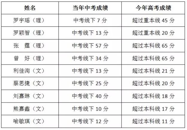 我校當(dāng)年中考重點(diǎn)線上20分的學(xué)生在本次高考中重本上線率高達(dá)100%(而成都名校學(xué)生當(dāng)年入口普遍在中考重點(diǎn)線上50分以上,但今年高考的重本率也只有80-90%);當(dāng)年中考重點(diǎn)線上學(xué)生本科上線率同樣達(dá)到100%。還有不少當(dāng)年中考未上重點(diǎn)線的學(xué)生,在本次高考中分?jǐn)?shù)也遠(yuǎn)超本科線甚至重本線。現(xiàn)列舉部分學(xué)生中、高考分?jǐn)?shù)對比表:
