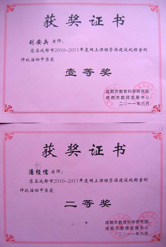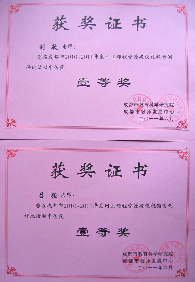 祝賀我校教師在成都市2010--2011年度網上課程資源建設視頻案例評比活動中獲獎!