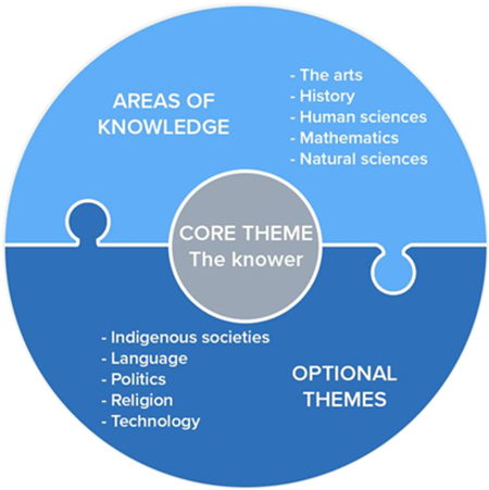TOK是一門側重批判性思維和探究學習過程的課程,旨在為學生提供一個機會,對知識的本質和認識過程進行探索和反思。它圍繞著對知識問題 (Knowledge Questions, KQs) 的探索展開,這些問題是關于知識本身的爭議性問題,旨在探討知識是如何產生、獲得、分享和使用的。TOK課程并非側重具體的知識體系或某一領域的知識,而是強調所學到的知識與其余學科之間互相支撐、借鑒的關系。課程內容結構性地分為三個深層關聯的部分:核心主題(知識與認識者)、選修主題和知識領域。在知識領域(AOKs)方面,課程要求學生研習五個必修領域,即:歷史、人文科學、自然科學、藝術和數學。此外,學生還需研習核心主題(知識與認識者),并從五個選項中選擇兩個選修主題(包括知識和技術、知識和語言等)。