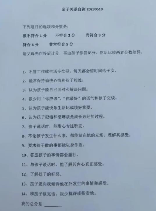 家長填寫《親子關系自測表》后,黃老師請家長對照結果進行分析:總分在52分以下,表示親子關系已有危機,需及時調整;總分在52到56分之間,表示親子關系良好,還可加深;總分在56分以上,表示親子關系很好,請繼續保持。