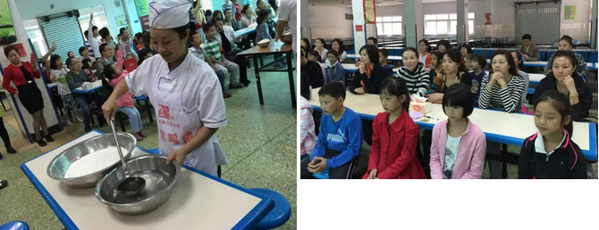 食堂的師傅一邊和面,一邊講解和面的秘訣,即水和面粉的最佳比例。讓孩子們知道要一邊和面一邊加水,一斤面粉加0.45升水。