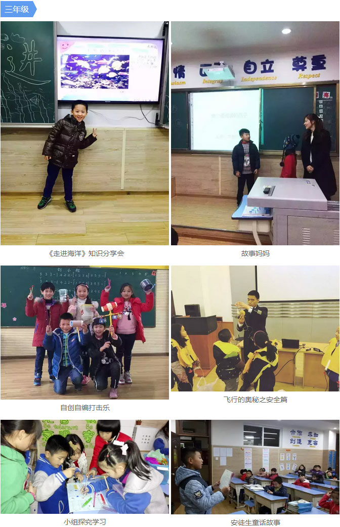 三年級的小伙伴們則在爸爸媽媽的幫助下,開展著豐富多彩的班級活動。用心描述《安徒生童話故事》,“走進海洋”知識分享會,帥氣的機長爸爸帶來的飛行知識講座,音樂創編活動,故事大王,故事媽媽等等。孩子們在高效、快樂和溫暖的活動中感受著學習的樂趣和成長的幸福滋味。