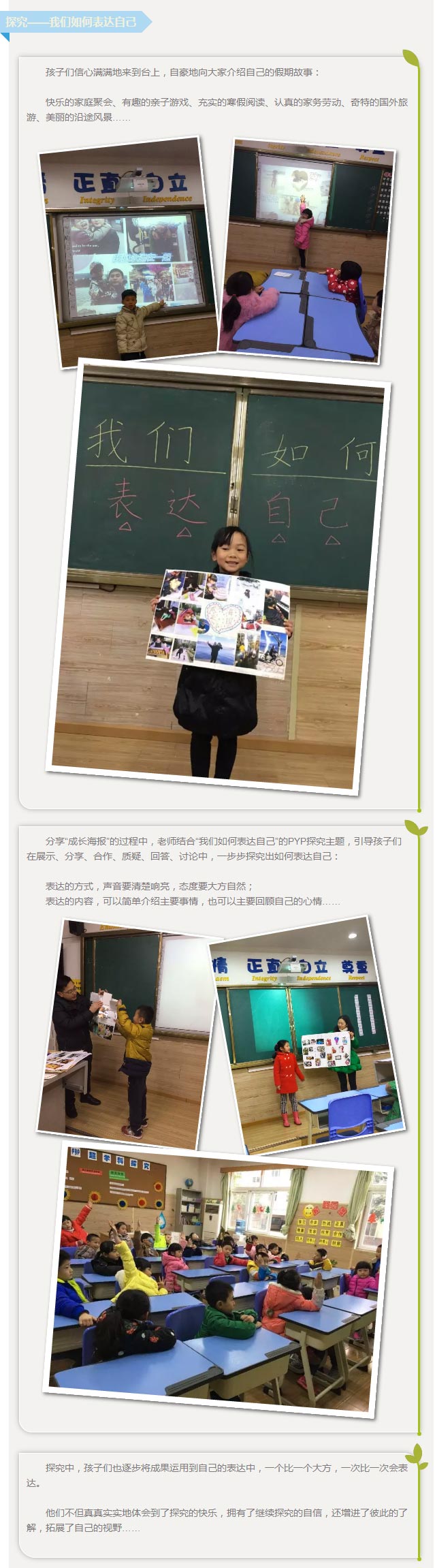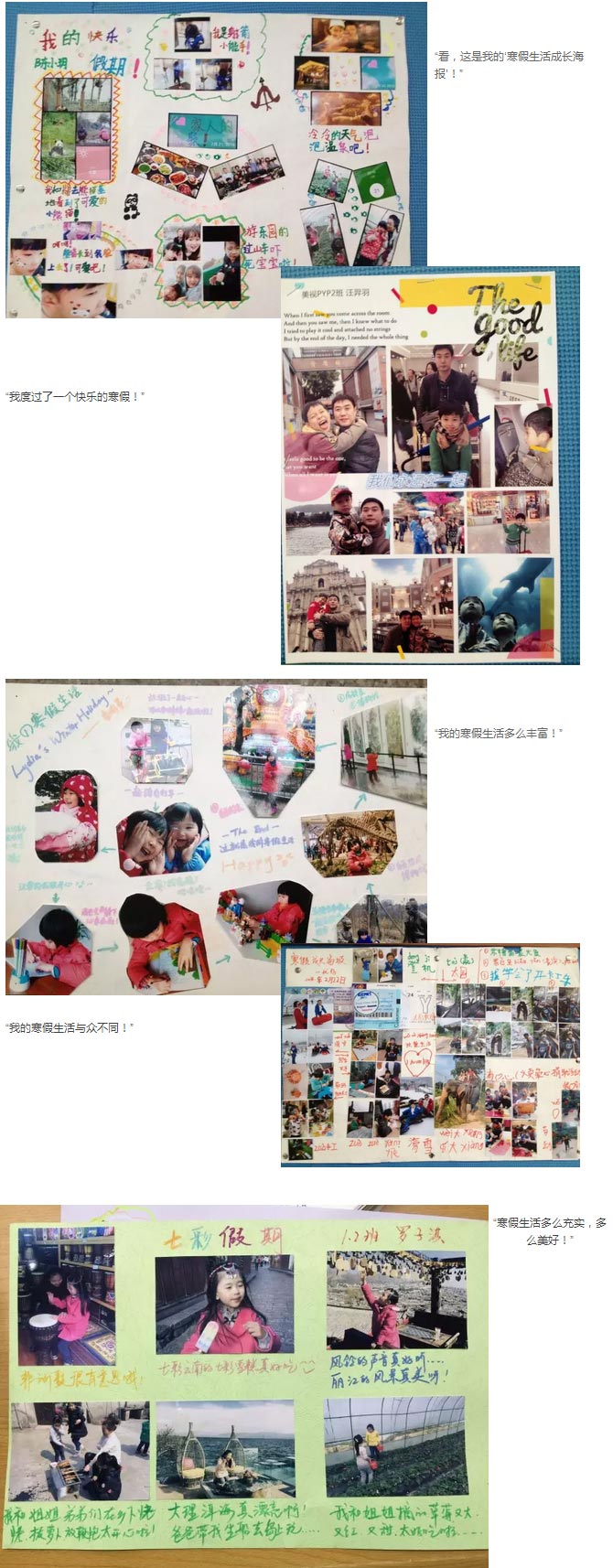 開學第一課“我們如何表達自己”的探究中,孩子們紛紛展示出自己與爸爸媽媽共同制作的“寒假生活成長海報”。