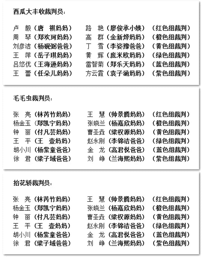 (西瓜大豐收、毛毛蟲、抬花轎的裁判員兩人(家長(zhǎng)志愿者和老師)一組負(fù)責(zé)一個(gè)組,主要是清點(diǎn)比賽隊(duì)伍的人數(shù),負(fù)責(zé)提示比賽中不要犯規(guī))“逼著”大朋友們參與運(yùn)動(dòng),綠色健康生活從自己做起!因此,讓我們期待大小朋友們的默契與合作吧!(后續(xù)報(bào)道將在我們的“回味篇”中呈現(xiàn)。)