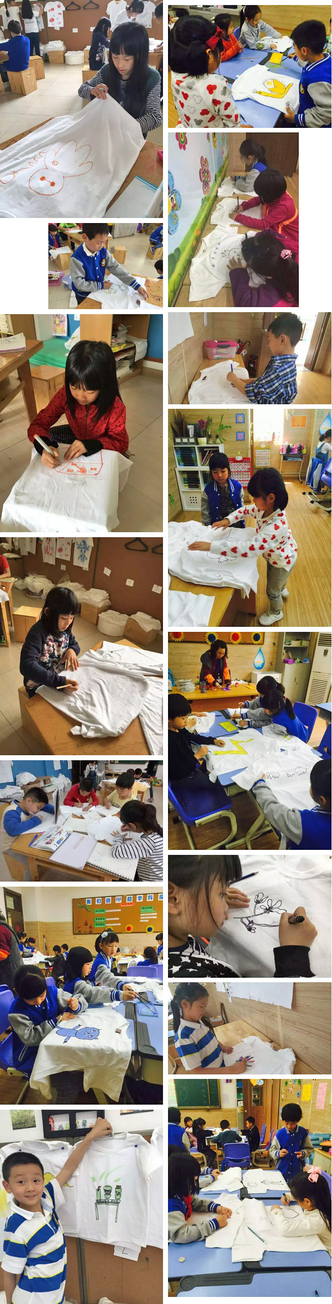 項(xiàng)目班級(jí)的孩子似乎已經(jīng)習(xí)慣了一件事情,那就是自己的事情要有自己的主意或者觀點(diǎn)。瞧!一件普通的白色T恤,加上各自的創(chuàng)意,讓藝術(shù)的表達(dá)呈現(xiàn)在自己的“戰(zhàn)衣”上,這是多么令人興奮,多么值得驕傲的事情啊!