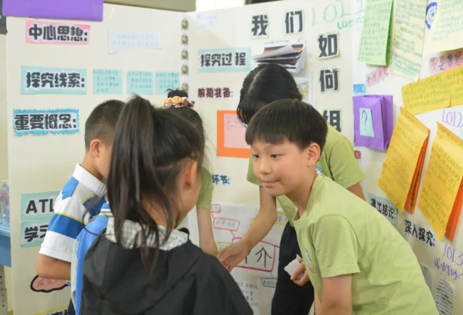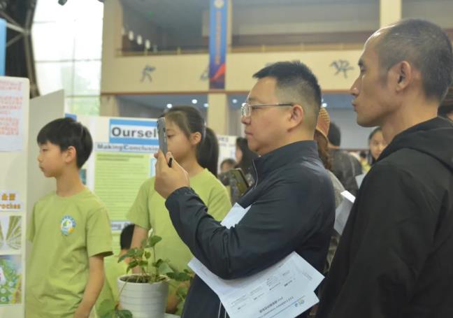 會場內,整齊而有序的擺放著一張張孩子們在導師的指導下精心設計的展板。孩子們站在自己設計的展板前,就像一個個小小演說家帶著自信滿滿的微笑,迎接著一波又一波前來參觀和提問的嘉賓們。他們從容不迫,侃侃而談,用自信流利的中英雙語,運用多元的分享形式,或娓娓道來,或深入淺出,或靈活互動,向每一位觀眾用心闡述著自己的探究成果和收獲。有感于孩子們超乎年齡的溝通、思考、演講、探究與應變能力,家長和來賓們頻頻豎起大拇指,連連稱贊,更紛紛忍不住在感興趣的展板前傾聽、思考、欣賞并合影留念。