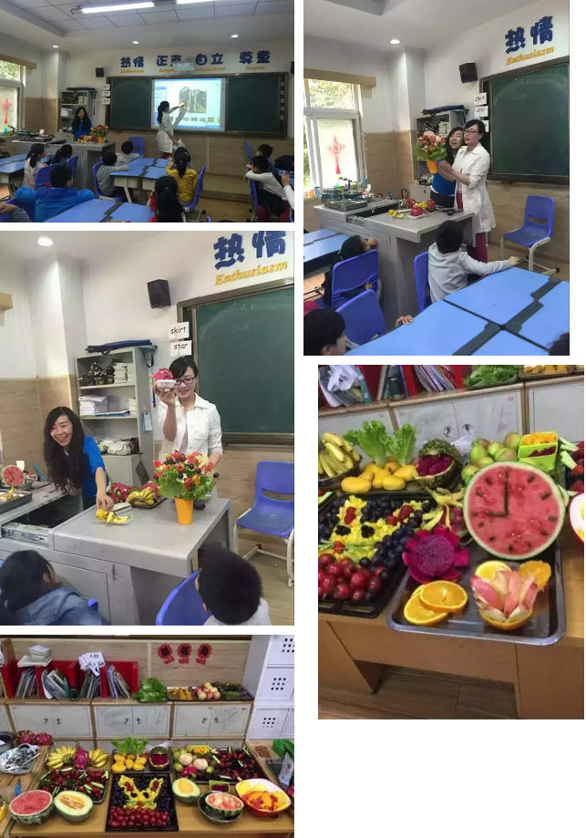 不一會(huì)兒,火龍果變成一只“憤怒的小鳥(niǎo)”;香蕉變成了可愛(ài)黃色小狗;西瓜變成了一個(gè)圓圓的漂亮?xí)r鐘;講臺(tái)上的那束花竟然也是可以吃的水果;這個(gè)拼盤(pán)里的兔子是由草莓、芒果、葡萄、小番茄做成的……
