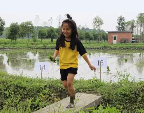 在聽完講解員對插秧方法的解說后,同學們快速跑到秧田里準備進行比賽。