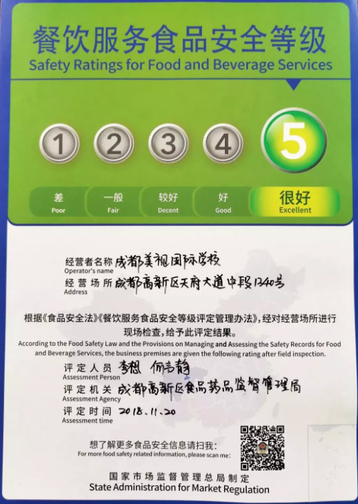 2018年12月,成都市高新區(qū)食品藥品監(jiān)督管理局正式向美視頒發(fā)了餐飲服務食品安全等級最高級別證書——“餐飲服務食品安全等級5級”證書。?