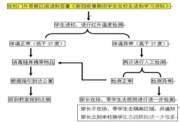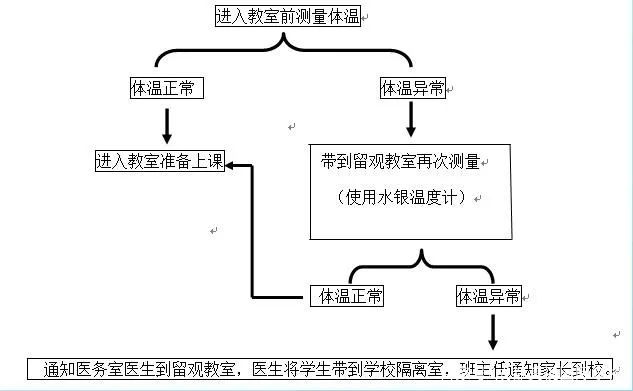 1、班主任于下午上課前對學生進行體溫測量。發現異常情況(兩次測量均超過37°),立刻將學生帶到留觀教室(初中樓109,高中樓101),并撥打應急辦公室電話(85330878)告知情況。